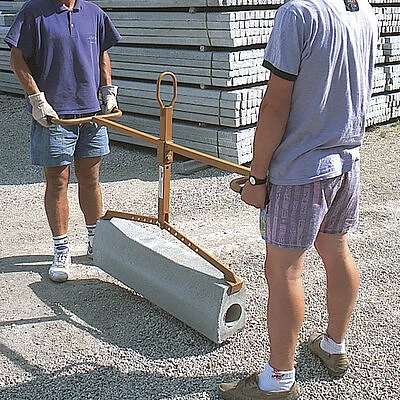 Le modèle PZC-L est une pince adaptée au transport de dalles et bordures en béton. Un support angulaire sur un côté, qui s'appuie contre la bordure déjà posée, permet un positionnement rapproché, tandis que la prise à la tête de la bordure permet une utilisation dans des espaces très restreints. Elle peut être utilisée manuellement à l'aide des poignées latérales et avec une grue ou une excavatrice en utilisant l'anneau de levage positionné au centre.